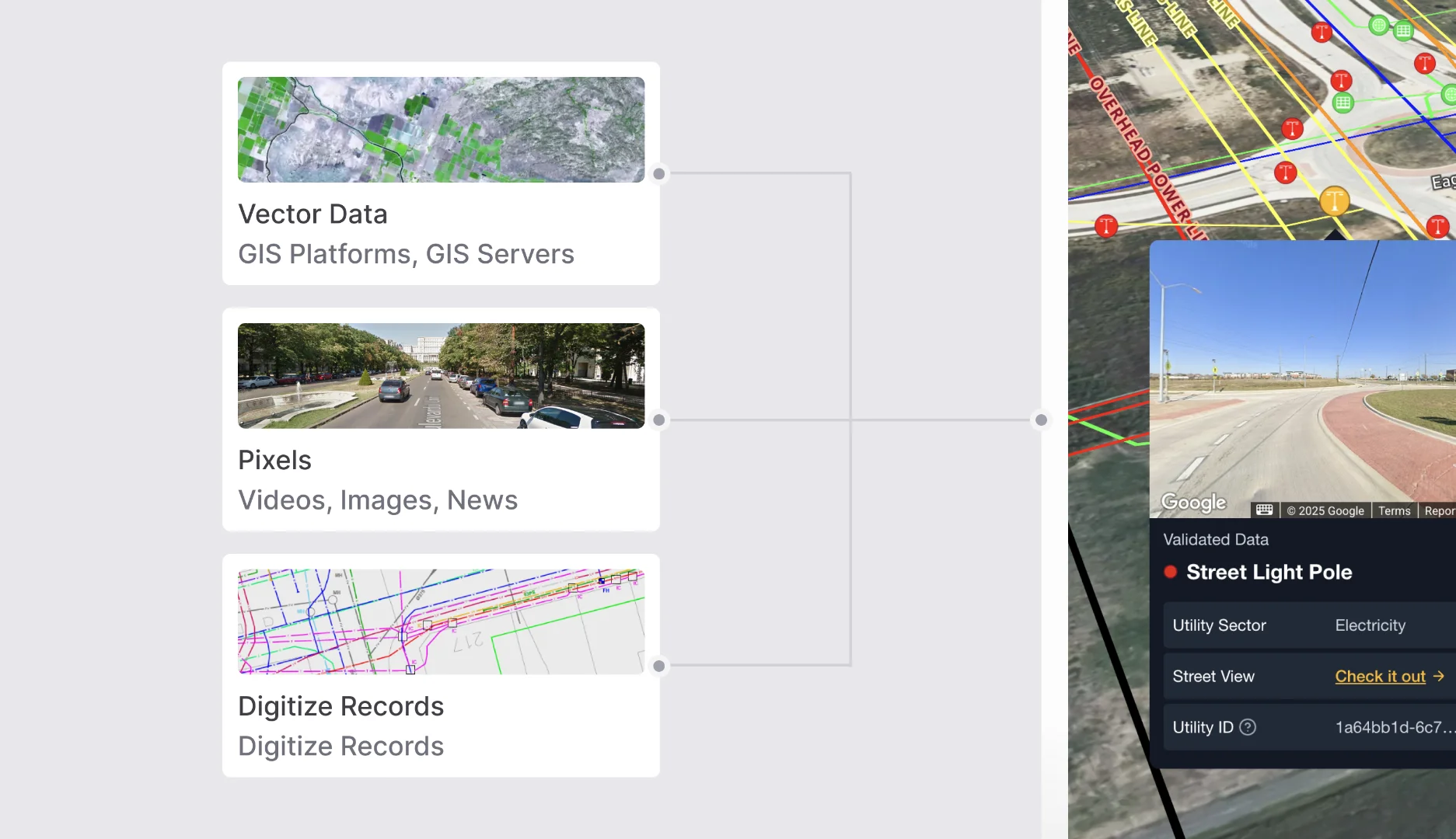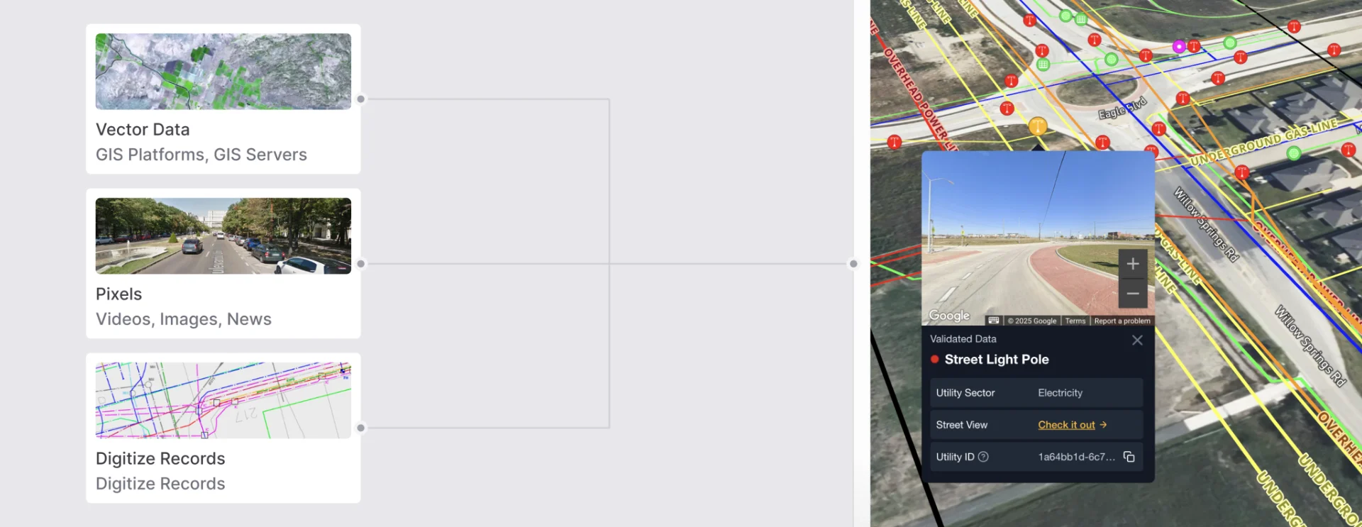 - Aggregation of massive amounts of data in multiple formats, including state and municipal GIS databases, PDF blueprint packages, SUE studies, as-builts, and street-level and satellite imagery