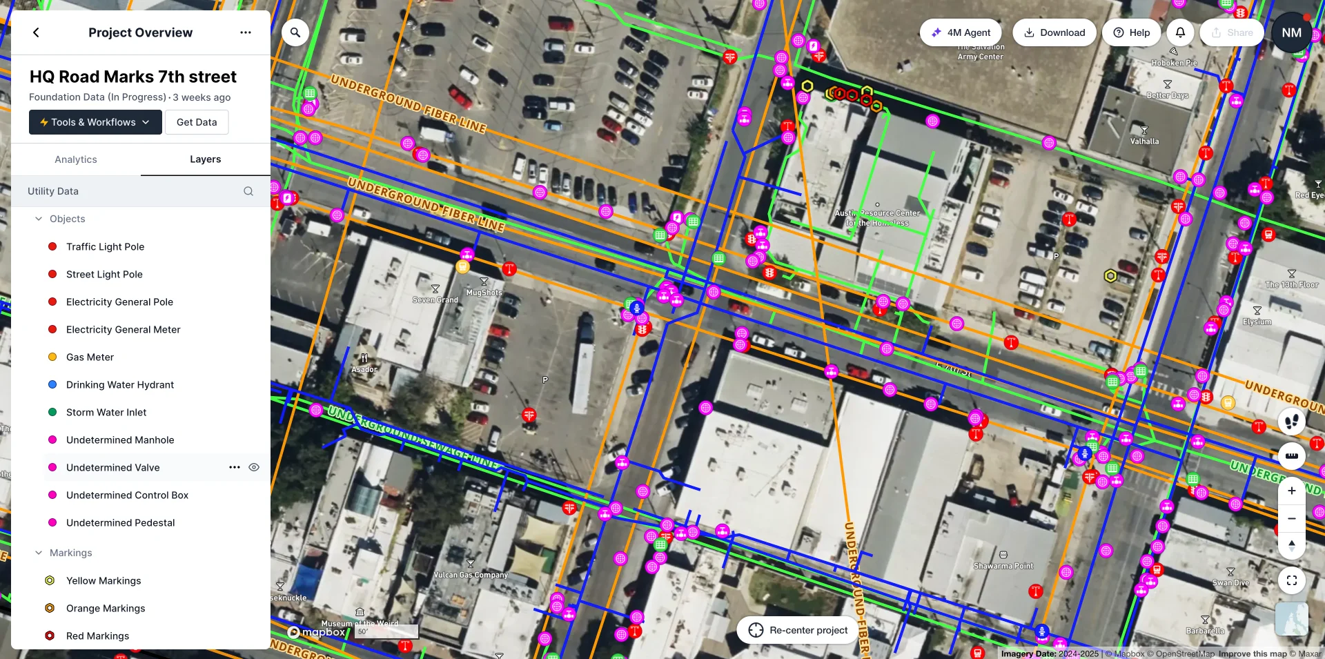 In 2024–2025, 4M launched two noteworthy features using computer vision to identify on-surface evidence of utilities from street-level and satellite imagery. The first feature, Object Detection, identifies utility features such as manholes, inlets, hydrants, utility poles, valves, and more, in order to augment existing records and enrich utility line data with associated objects. 4M’s Object Detection algorithm currently achieves 85% completeness with 95% accuracy, with consistent improvements projected over time.